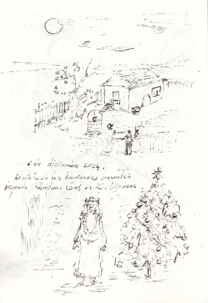Pero lo que vengo a contar ahora es que acabo de verlo perdido en la balda donde tengo esas carpetas de escritos y que había olvidado que lo tenía. No buscaba nada, solo lo he visto de refilón y me he sorprendido de ver esa cosa pequeña y delgada filtrada entre sus compañeros más grandes. Me dije: «Anda mira, es cierto que estabas tú por aquí.» Me he sentado a la mesa para revisar su interior un poco y me he encontrado con estos apuntes que hice allá por el mes de diciembre de 2024. Tengo un vago recuerdo de que hice estos apuntes sentada en el sillón de nuestro salón donde suelo sentarme. Andaba ya un poco perdida con respecto a esto del dibujo, y me refiero a esas zarandajas de la apetencia, la necesidad o el rechazo en cuanto al dibujo (de pintar igualmente, pero yo a todo lo llamo dibujo). En cualquier caso, ya andaba un poco perdida y extrañada en vísperas de las Navidades y casi me forcé a dibujar algo.