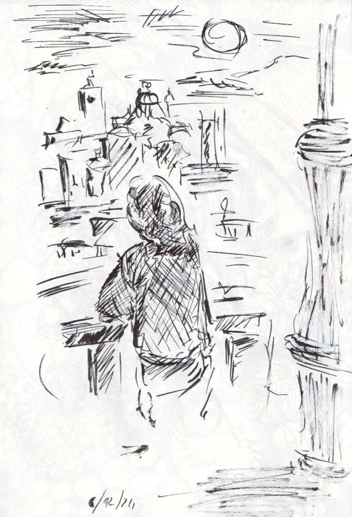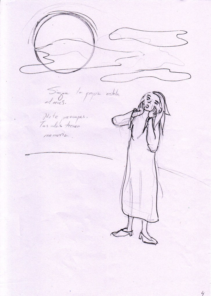 Sin más que contar acerca del diálogo que me fue llegando según avanzaban los bocetos, ya he dicho antes que dejé que los dibujos reposaran. La verdad, es que más que dejarlos reposar, los aparté. Había una parte de mí que me decía que, si las cosas fueran como hace mucho tiempo, enseguida me habría puesto a darles más forma y quizá color. Pero no me encontraba como hace mucho tiempo, lo que no significa que fuera cosa mala; solo que era diferente.