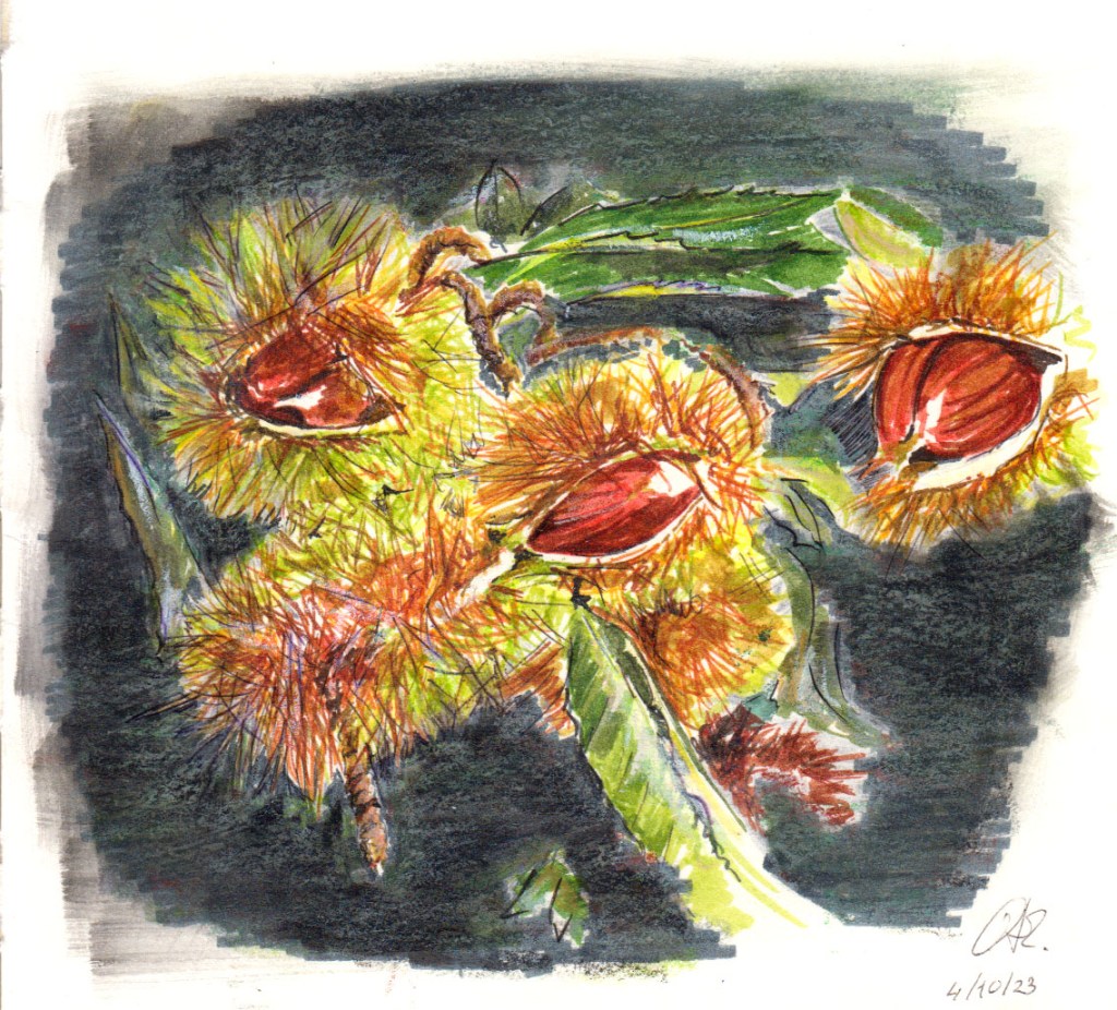 Estos frutos de Castanea sativa, el sencillo castaño que da castañas que sí se pueden comer, parecen erizos en sus caparazones. Difícil hacerte con uno de ellos sin pincharte. Este dibujo llegó unos días antes del espino blanco, pero lo hice en la misma época, octubre 2023, y con los mismos materiales. También recogí el ejemplar en el transcurso de uno de nuestros paseos. En la Calle Real del pueblo, en dirección a la estación de tren de cercanías.