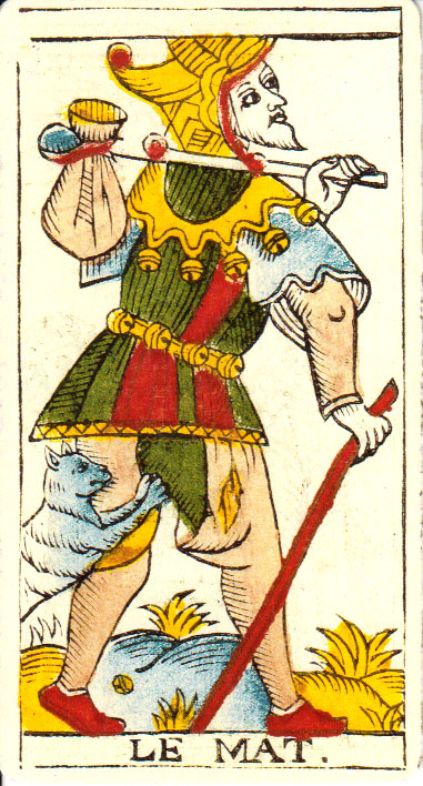 Hay un libro al respecto de una seguidora de las lecturas o lecciones de Jung que hace buenas reflexiones acerca del significado de la baraja del Tarot, en concreto de los Arcanos Mayores, que son en realidad arquetipos que anidan en el colectivo humano (Jung y el Tarot de Sallie Nichols). Dejé hace tiempo de ser una aficionada a las lecturas en torno a la psicología y las búsquedas de la identidad personal, así que tampoco persigo una lectura psicológica en el Tarot. Es más un juego mental, un juego creativo. No voy a entretenerme en dilucidar de qué tipo de juego se trata, solo que es sugerente y como poco atractivo, porque esta baraja de Marsella me resulta muy atractiva. Sus imágenes simplificadas, casi de dibujo infantil, invitan a emprender un viaje de aventuras, como lo de los cuentos. Y es que de eso se trata: de un viaje iniciatico, todas las veces. Y este viaje empieza por El Loco. El Loco, en realidad, somos cada uno de nosotros, que iremos haciendo, y tendremos que hacer, todas las paradas que nos proponga la vida.