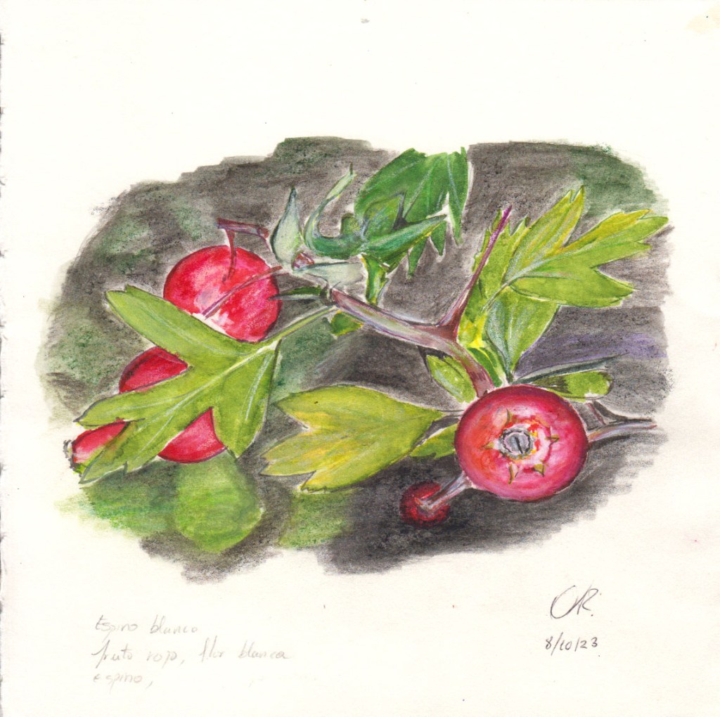 Al espino blanco le brotan unas florecitas blancas, menudas, bonitas; sus frutos, pues bueno, sus frutos son rojos como los que intenté reflejar en el dibujo de abajo.