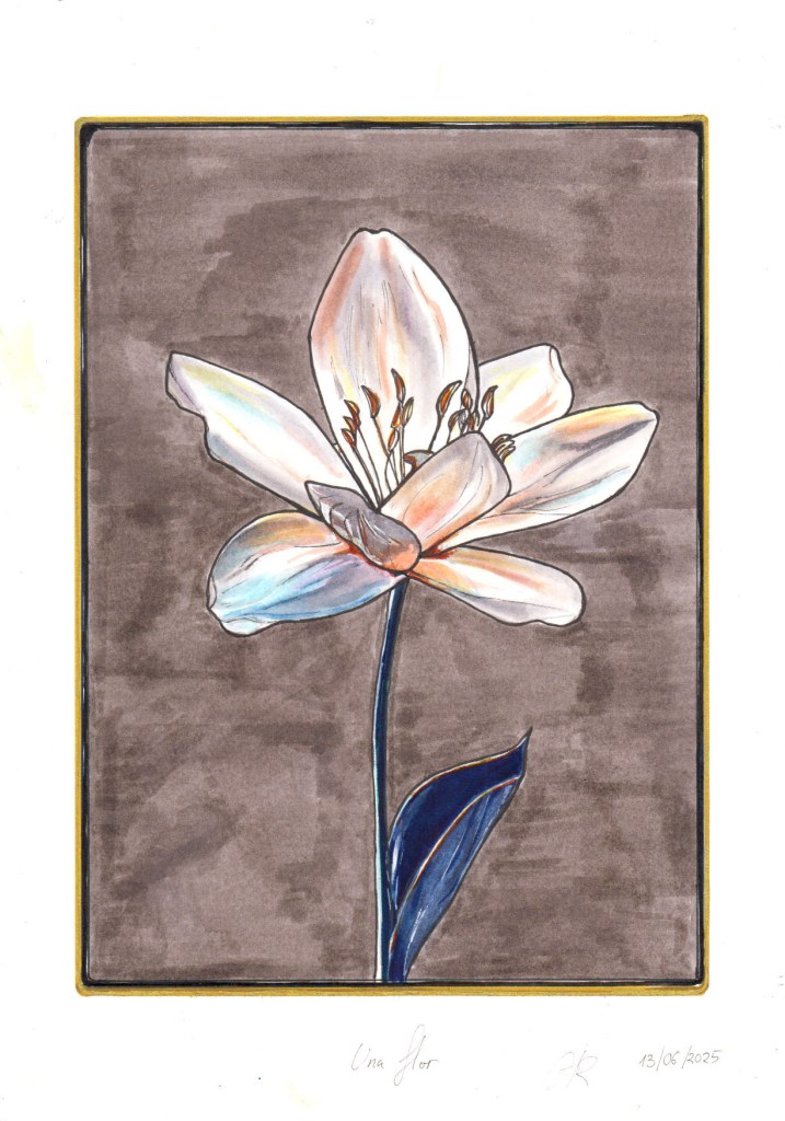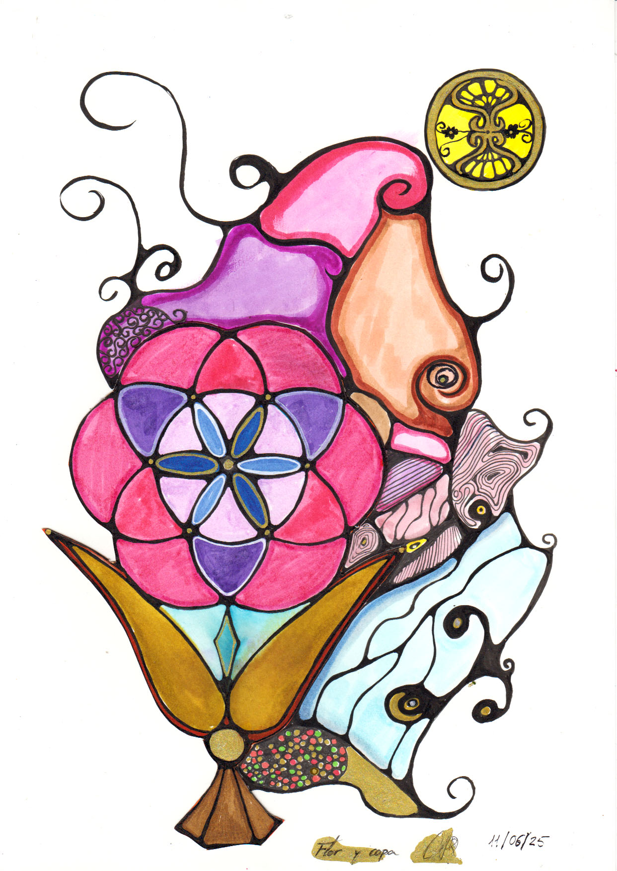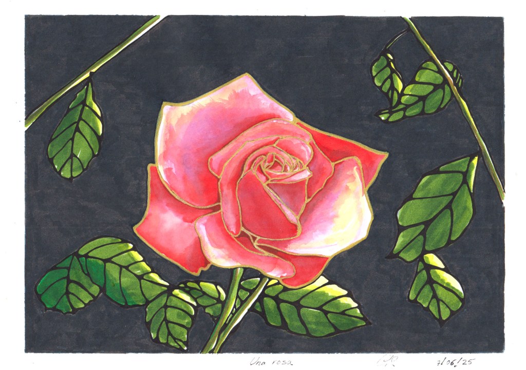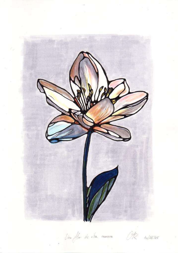 Han pasado los días. Estoy todavía espaciada, esponjada en mi espacio vacío. Respiro de manera extraña como para acostumbrarme a un nuevo elemento. Me acompañan papeles, grafito, un rotulador de tinta china negra con punta de pincel y rotuladores de colores para cuando me pongo colorida por dentro y necesito verlo por fuera. A excepción de alguna forma reconocible, como esta rosa, empienzo a desvariar y a hacer líneas que se buscan unas a otras y figuran alguna realidad alternativa. Y escribir, sí. También suelto algunas palabras que buscan juntarse las unas con las otras. Por lo demás, esto es solo una rosa, porque normalmente las cosas son lo que son. A qué darle más vueltas.