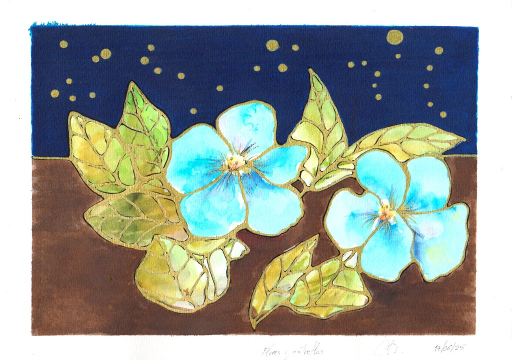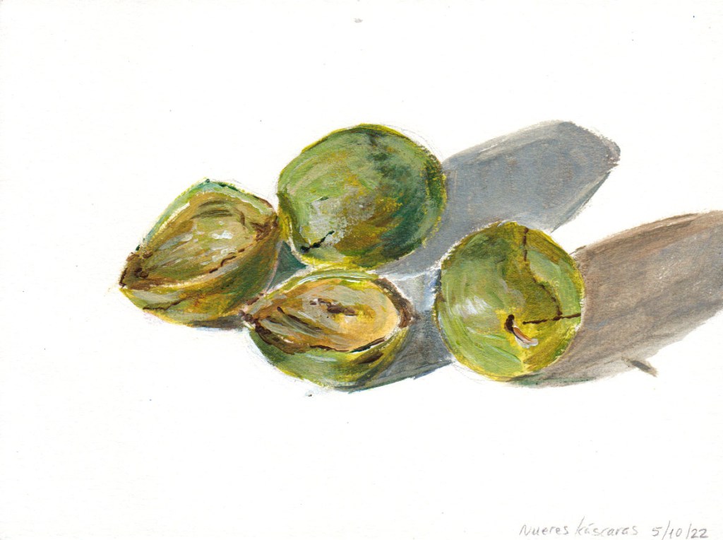 Si no recuerdo mal, este dibujo de las nueces lo hice tomando como modelo unas nueces que recogimos mi marido y yo de un nogal que hay junto a la iglesia del pueblo, por donde caminamos para pasear con nuestra perra. Representa una cáscara abierta y vacía y dos nueces con su fruto encerrado todavía. Era allá por el mes de octubre de 2022, casi un año después de mudarnos al pueblo desde la ciudad. Mi marido me decía que tuviera cuidado manejando la cáscara porque podía manchar bastante, lo cual es cierto. El dibujo lo hice con pintura acrílica, que en su momento me gustaba usar y con la que hice la mayoría de las pinturas durante ese año. Los acrílicos ya no están conmigo, como he dicho antes. Este es un relato testigo de cuando los usaba.