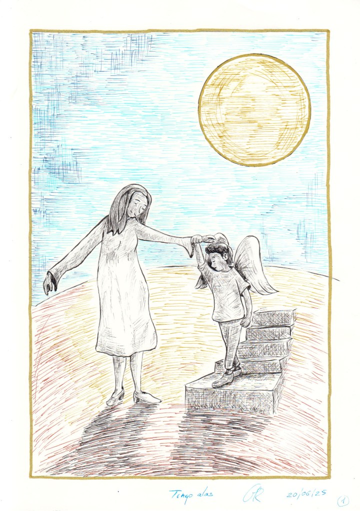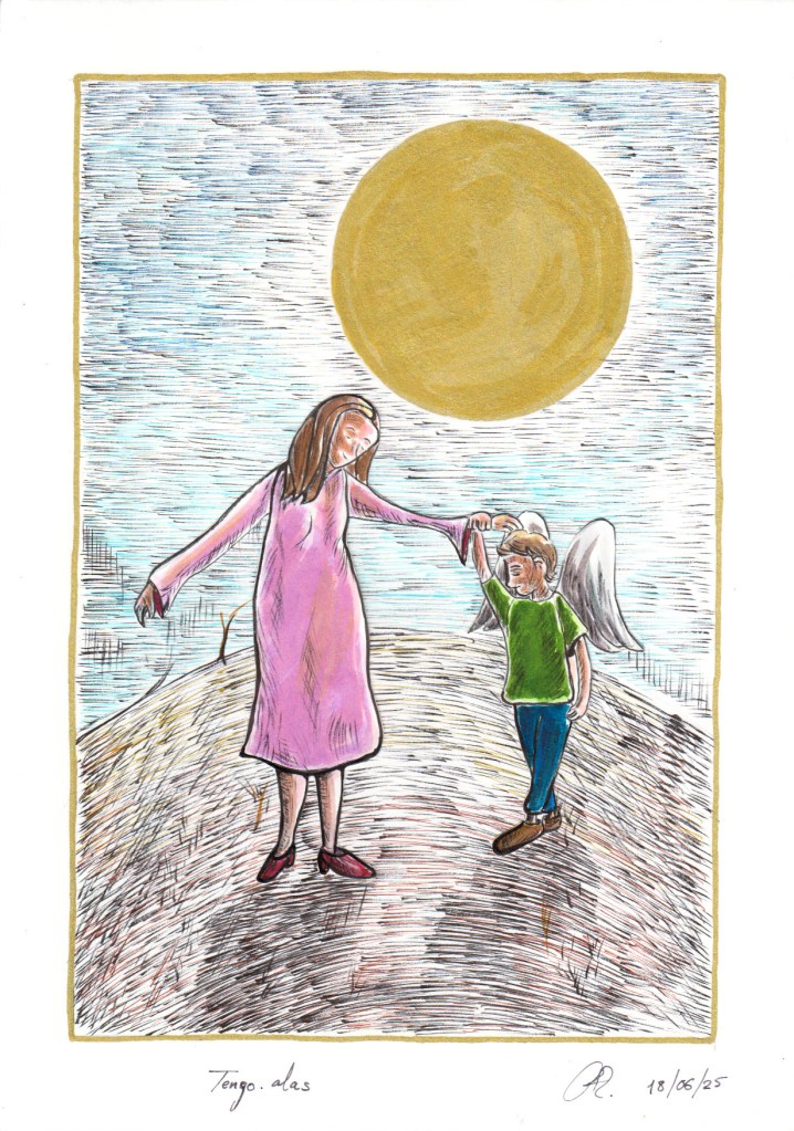 Empecé por el primero de los dibujos, el primero de los bocetos de arriba: ese en el que están la mujer y el niño con alas entablando su ambiguo diálogo. Hice un dibujo en el que los rotuladores aportarían el color y el perfilador de tinta china repasaría las líneas externas con su punta pincel. A continuación hice otro (el segundo dibujo a la derecha) aplicando color y añadiendo algunas líneas de volumen con plumilla en el interior de los cuerpos. Las figuras me gustaron, pero el resto no, así que recorté las figuras de la mujer y del niño y los dejé sueltos como recortables hasta que se me ocurriera qué hacer con ello. Finalmente hice un fondo con la plumilla y un rotulador azul celeste de punta muy fina, además del dorado del sol y pegué las figuras recortadas encima de ese fondo. Sinceramente, me gustó. Me parecía que jugaba con unos recortables o con una de esas pegatinas de quita y pon con las que jugaba de pequeña.