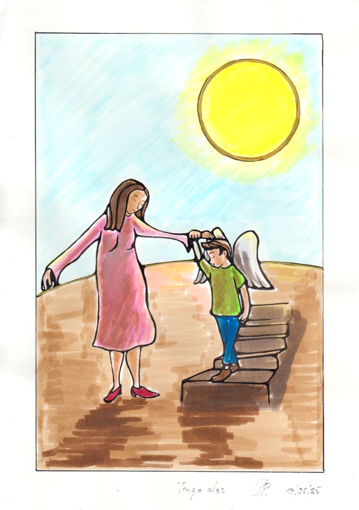 Primero fue la mujer con el niño que tiene alas. El niño baja de unas escaleras que no se sabe de dónde proceden. El sol es enorme y así posicionado, detrás de la cabeza de la mujer, parece que fuera un halo espiritual. Pues no fue mi idea, pero es como salió. A continuación le puse letra, una leyenda, que decía: