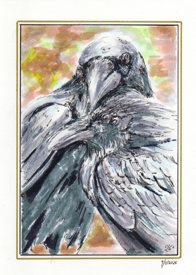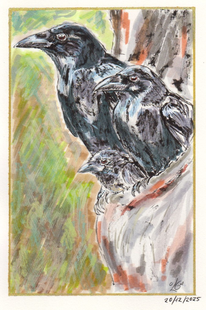 1. Me encantan los cuervos, hay muchos por aquí, son muy sociales e inteligentes, además muy longevos, hace algunos días me encontré una de sus plumas negras atornasoladas, hermoso encontrar ese plumaje y esa sociabilidad en tus dibujos, preciosos, Olga. Feliz semana, abrazos.