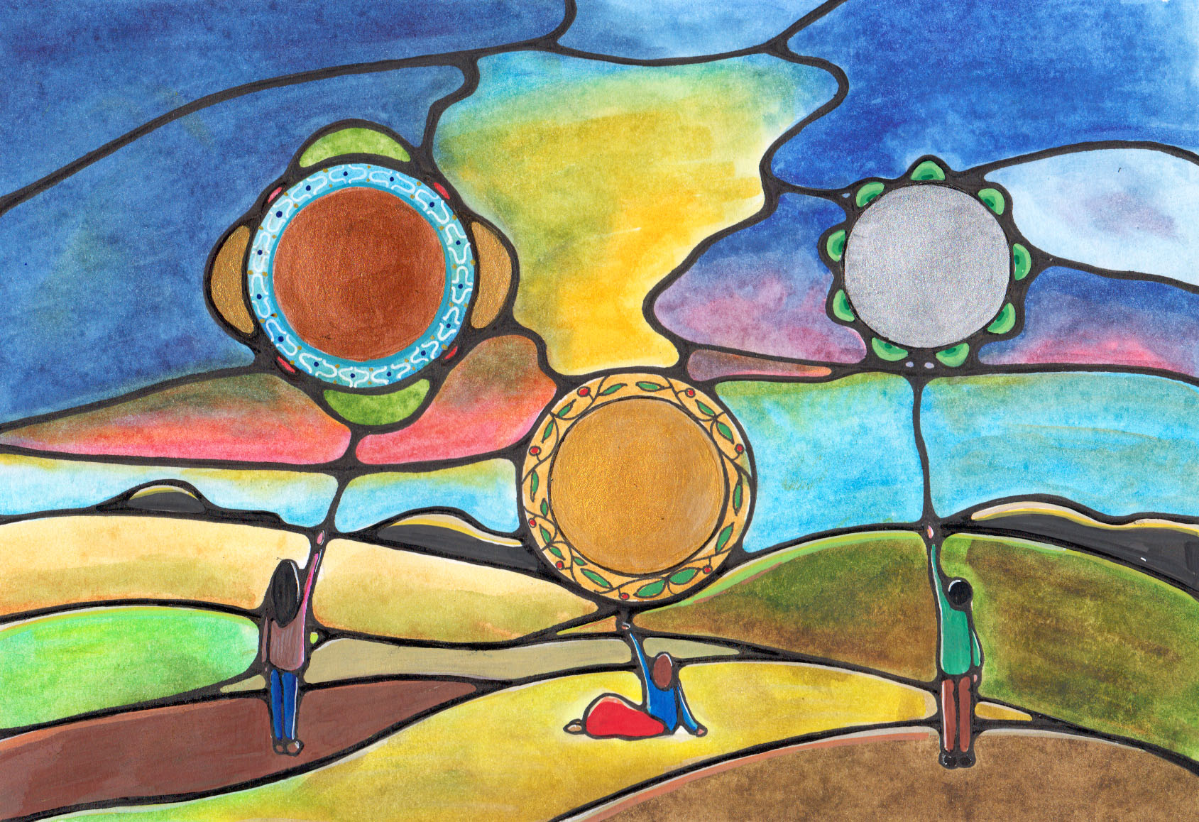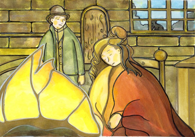 Sea como sea, unas ideas u otras fueron asomando en los dibujos que iba haciendo. En el siguiente avancé un poco más en esta dirección. Hice, además, una variación: incorporé el color dorado para los contornos. Ahí donde pensaba que podría añadir el reflejo de la luz, trazaba el contorno con dorado.