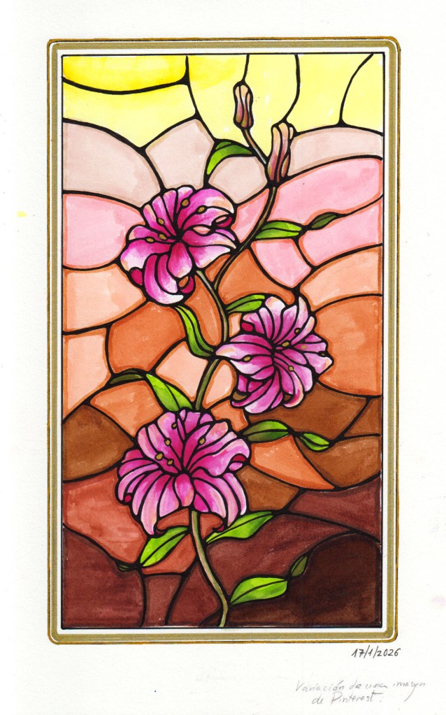 Al margen de lo que descubriera por mí misma y a través de aquellos que practican el dibujo neurográfico, creo que existe en el fondo —y alguna vez he compartido la idea en este blog— una fascinación por las formas que veo en las vidrieras. Me gustan las vidrieras, está claro, pero más me gusta sentir que una serie de piezas pueden unirse para crear una forma más grande que ellas mismas. Y tampoco tienen que tener la coherencia que vemos en la realidad, sino que puede ser susceptible de transformar esa realidad. Otro aspecto que me gusta de las vidrieras es esa coherencia en el color, esa forma de utilizar el color por bloques, sin gradación. La superficie, ya de por sí transparente o traslúcida, es la que genera la gradación gracias a la luz que la atraviesa. O bien los bordes interiores de los contornos crean un resalte añadido, una especie de sombra que recorre el contorno por dentro, también debido a la luz.